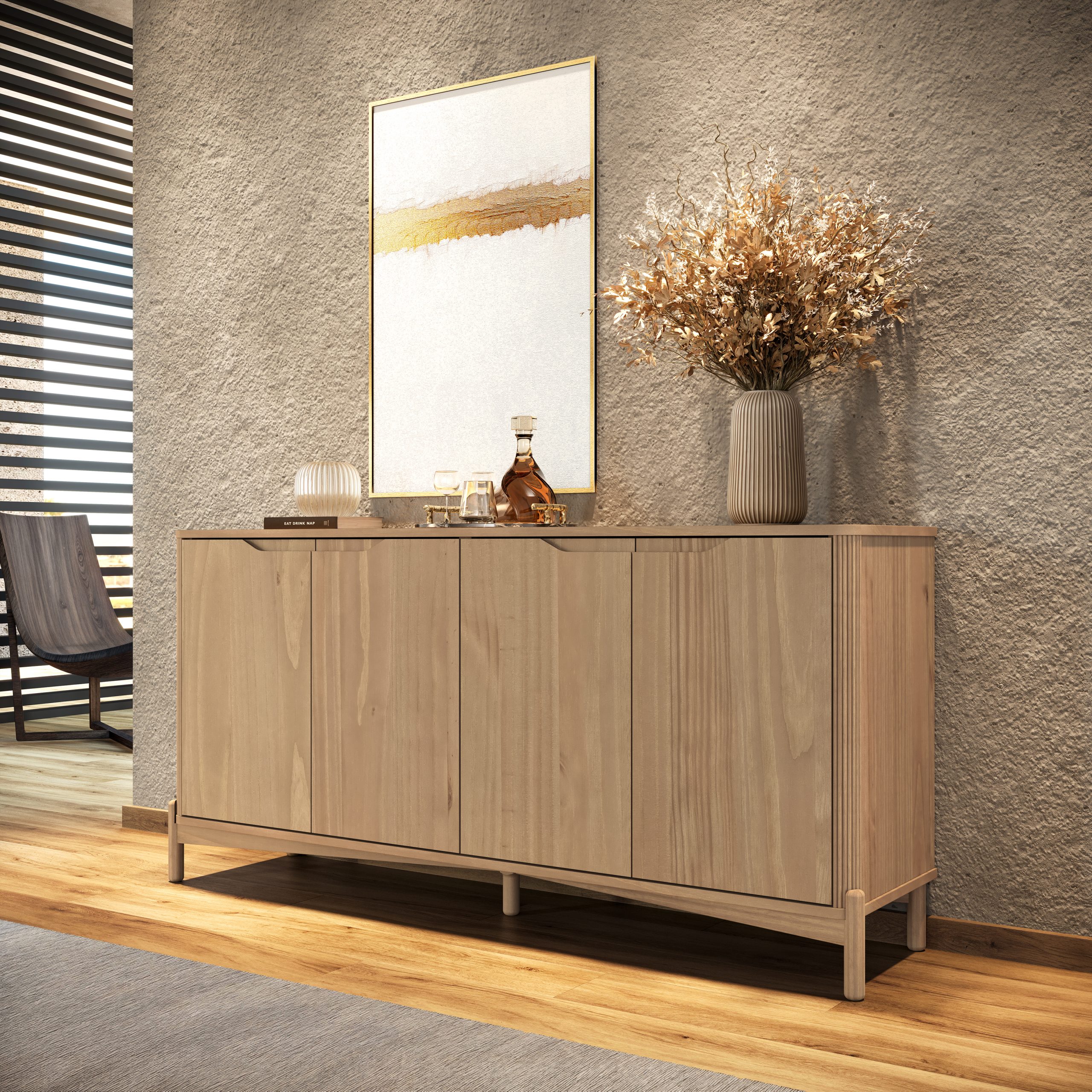 Linhas suaves e volumes arredondados transformam o ambiente em um verdadeiro refúgio de serenidade. A Madeira Maciça Taeda, com sua presença calorosa e toque orgânico, encontra no canelado um ritmo delicado, que dança com a luz e cria sombras sutis, despertando sensações. O nome Nest, que em alemão significa “ninho”, reforça a essência de abrigo e acolhimento, um lugar onde o tempo desacelera e cada detalhe foi criado para inspirar permanência, conforto e a tranquilidade que transforma o simples ato de estar em uma experiência sensorial.
